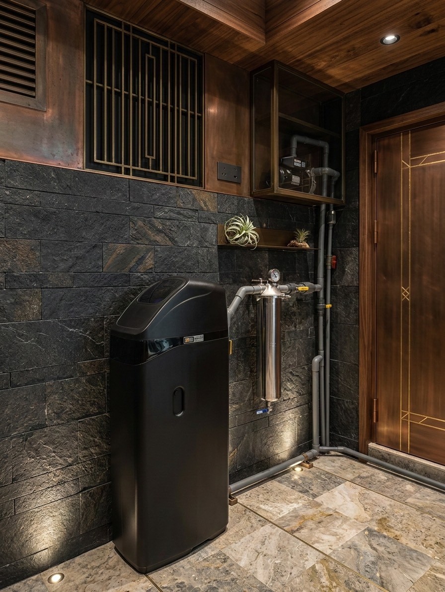 高階配置:選用 jy25001 全戶軟水系統,其黑色流線型機身能低調隱身於陰影中;輔以 YC不鏽鋼抑垢器,增加設備耐用度與科技感。